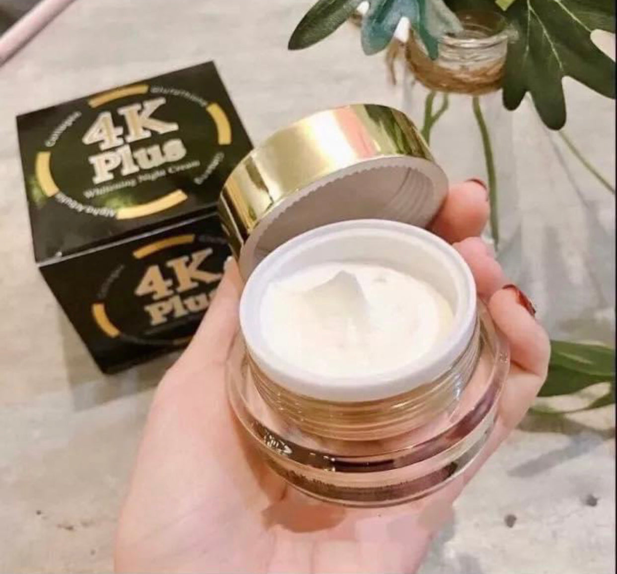 Facial cream, night cream 4K plus. Contains glutathione. Helps fight free radicals Reduce the production of melanin pigment that causes dark skin, freckles, and wrinkles by helping the intensity of dark spots gradually. Decrease.Alpha arbutin and collagen Helps tighten pores Makes the skin smooth, firm, white, clear and pleasant to the touch.And has ingredients from Korean ginseng. Helps deeply nourish the facial skin. The cream is rich in extracts from Snow Lotus, reducing inflammation and pus-filled acne.