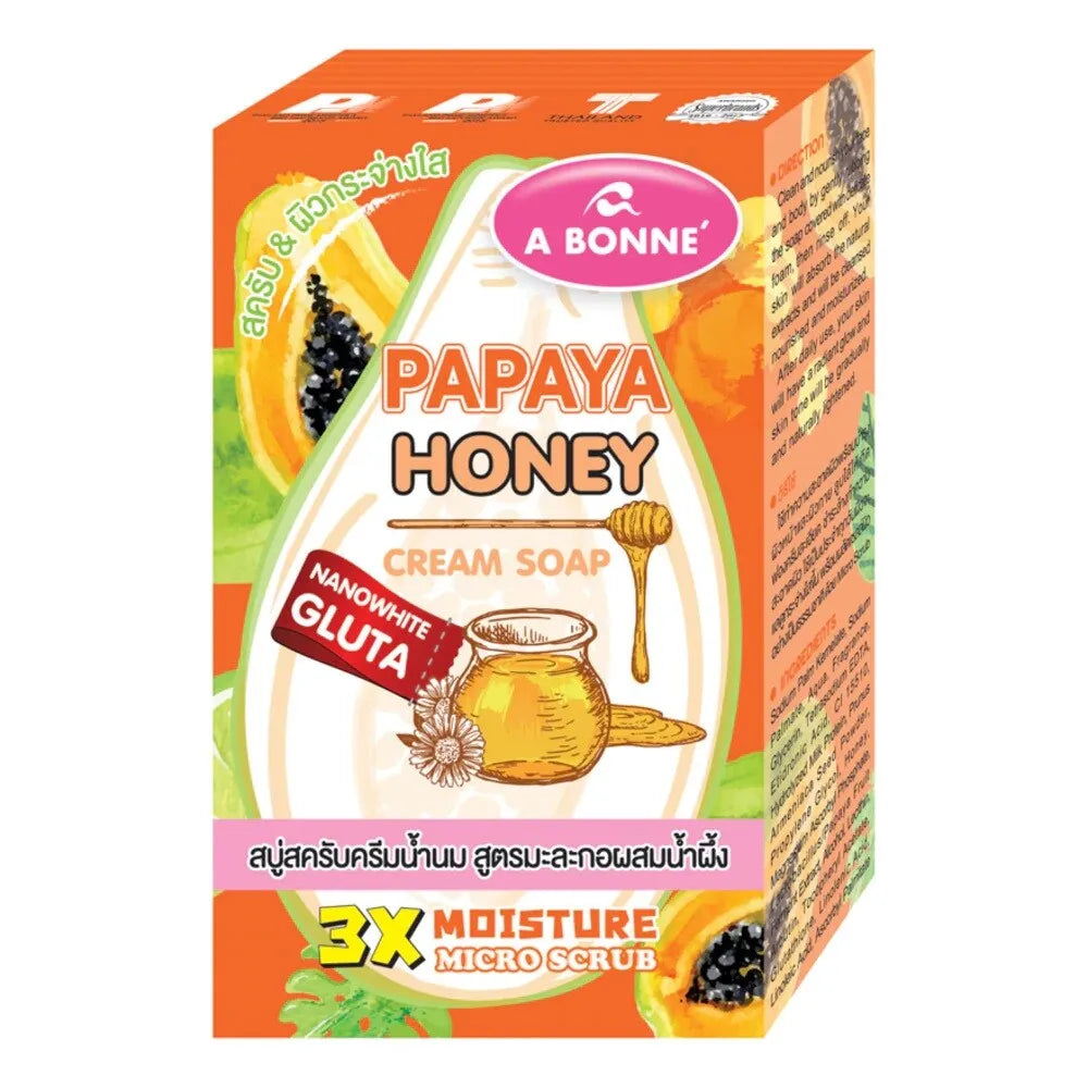 A Bonné Papaya Honey Soap.Enjoy taking shower and lather up with this special cleansing soap. it’s formulated from Papaya Extract and Vitamin C which help illuminate your skin tone and reduce dark spots. Honey Extract and Milk Protein effectively hydrate and help lighten your skin tone. Gentle and delicate cream foam will make you feel fresh and relaxing and it’s good for helps removing dead skin and revealing new healthy skin.
