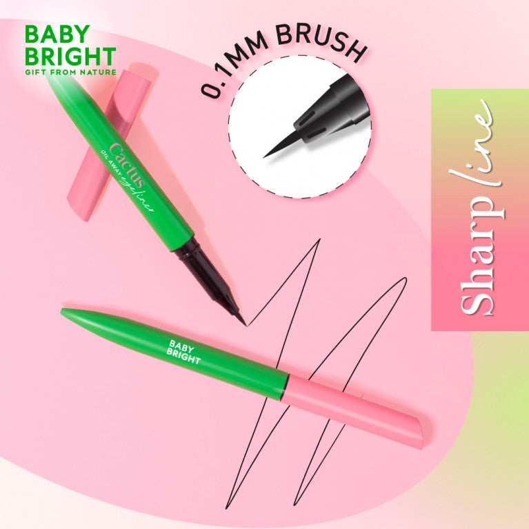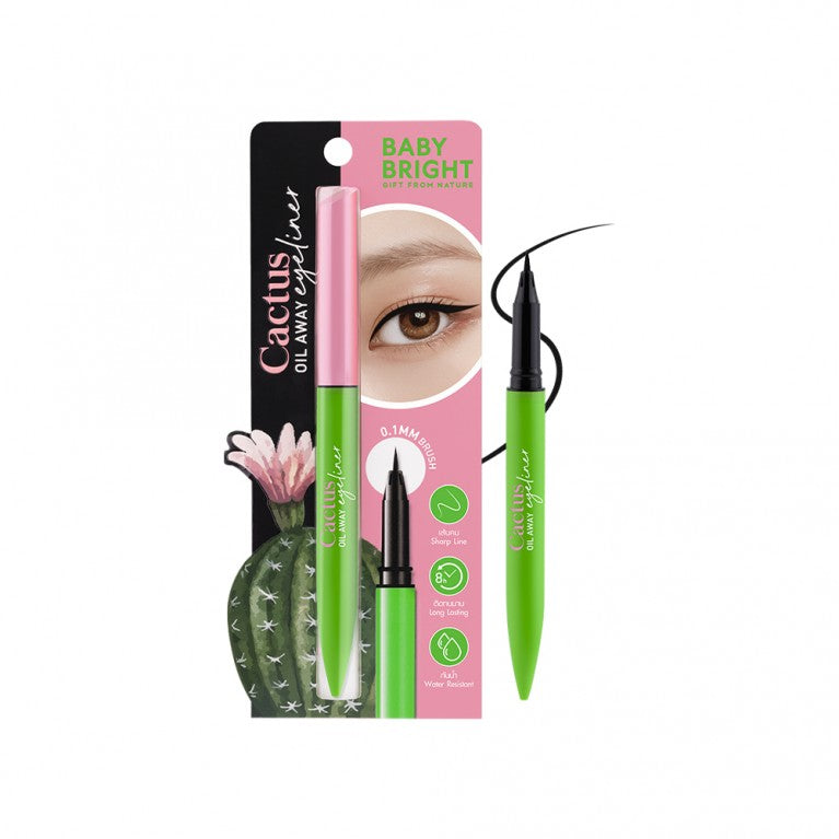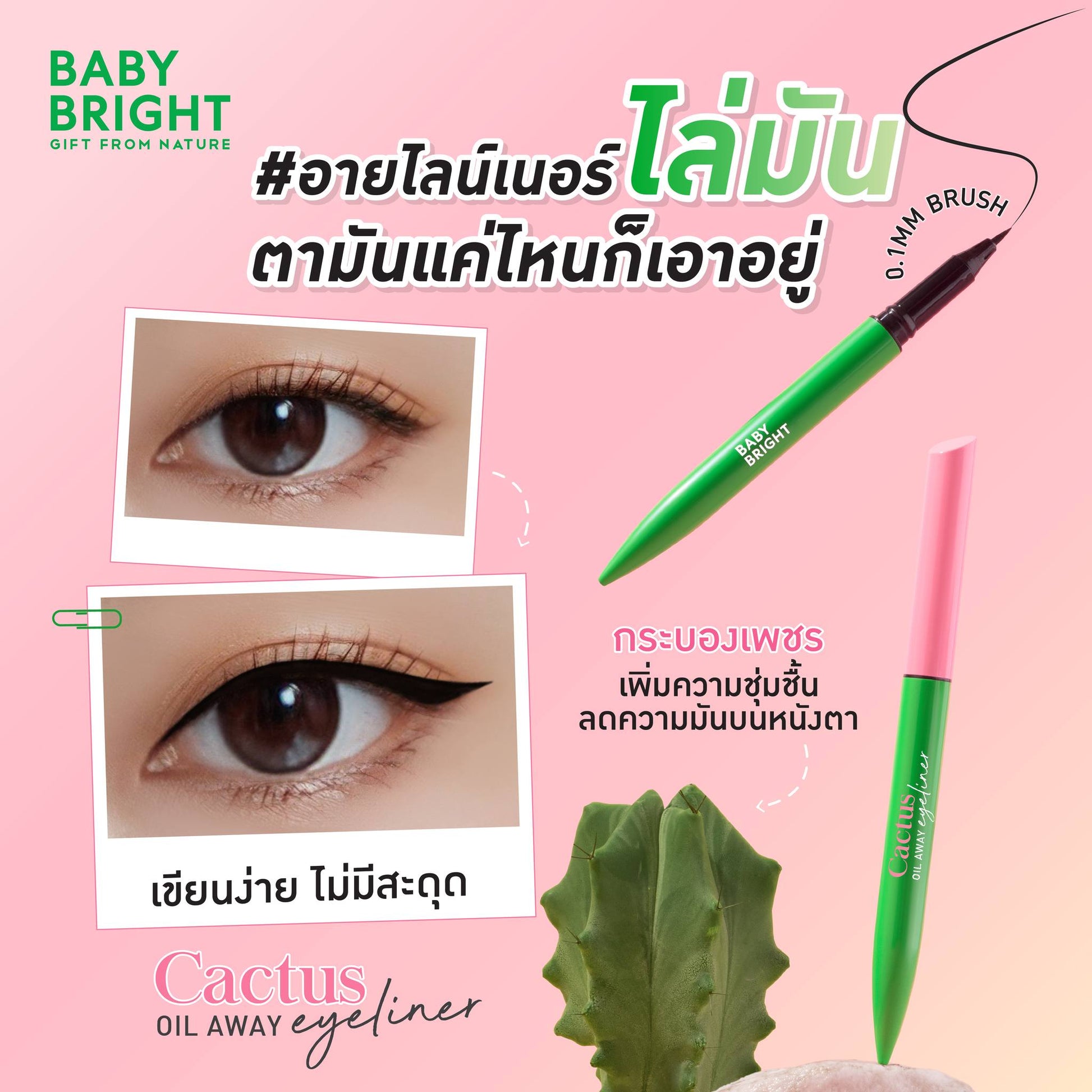 Baby Bright Cactus Oil Away Eyeliner, sharp magic tip, easy to draw without interruption, waterproof, sweatproof, long-lasting, comes with cactus extract (Opuntia Coccinellifera Extract), rich in antioxidants, helps increase moisture, protects against water loss in the skin, gentle on the skin and reduces irritation, combined with the power of wheat protein extract (Hydrolyzed Wheat Protein), helps nourish and increase moisture, making the skin around the eyelids look radiant, smooth, soft, moist, reduces oiliness on the eyelids, ready to show off beautiful, sharp eyes all day long.