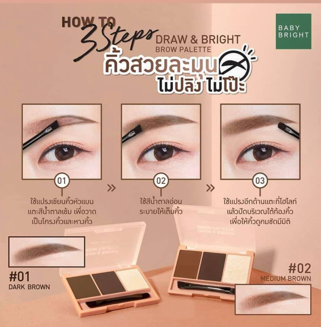 How to use: Open the product cap. Use the flat end of the eyebrow brush to apply a dark brown color. To draw the outline of the eyebrows and the tail of the eyebrows Then use a light brown color to paint it all over. Use the other side of the brush to dab an appropriate amount on the brow highlighter. Then brush the area under the brow to make the eyebrows look sharper and more dimensional. Close the cap tightly after every use.
