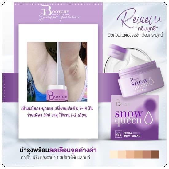 Bootchy White Snow Queen Body Cream, the ultimate body cream,concentrated formula, rich in glutathione and arbutin, helps solve the problem of dark, matte skin directly, adjusting the skin to be radiant, smooth, soft, and naturally moisturized.