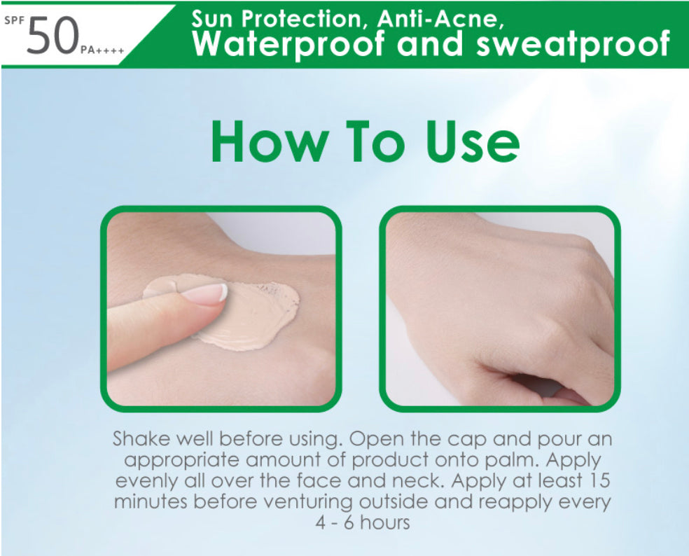How to use : Shake well before using. Open the cap and pour an appropriate amount of product onto palm. Apply evenly all over the face and neck. Apply at least 15 minutes before venturing outside and reapply every 4 - 6 hours.