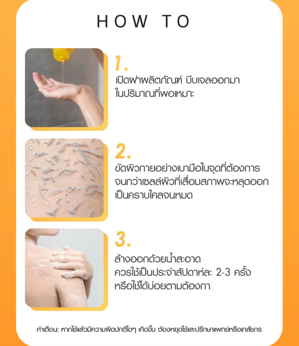 How to use : Twist to open the cap and get a good amount of product. Apply the peeling gel to your arms, legs, neck, elbows, knees and other desired spots. Then, gently rub it with fingers in circular movements to scrub away dead skin cells. Wash off with clean water. Close the cap tightly after each use. It is recommended to use before shower 2 - 3 times a week or as often as desired.
