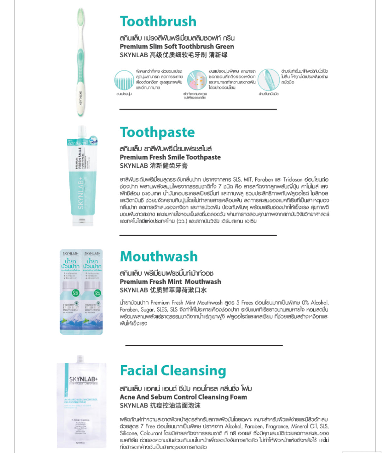 SKYNLAB TRAVEL KIT product set, portable size, suitable for travelers. Contains a premium quality oral cleaning kit. Helps reduce the accumulation of bacteria, reduces bad breath, and gives fresh breath. and facial cleansing products with a very gentle formula Passed tests from leading skin research institutes. Suitable for all skin types.