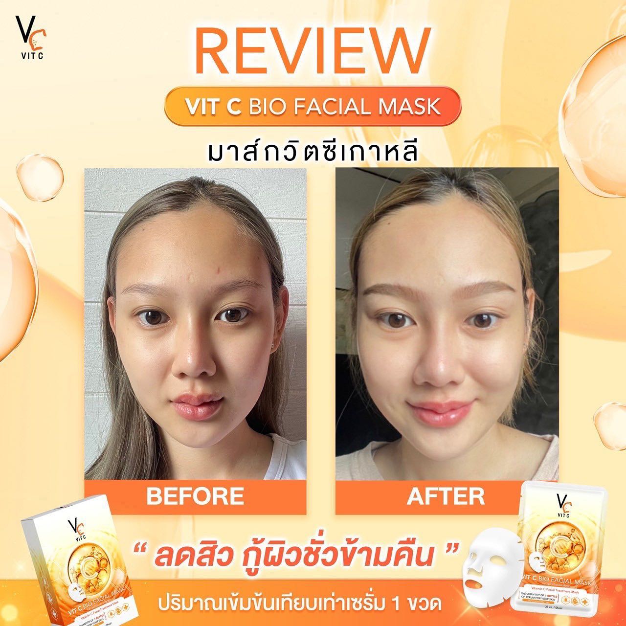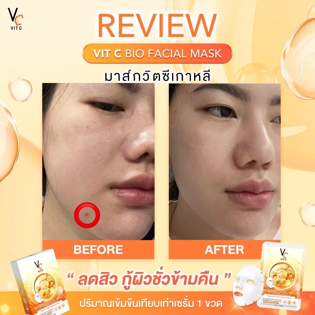 Vit C Bio Facial Mask is rich in concentrated vitamin C, Vitamin B3, Tranxamic Acid, Salicylic Acid help soothe the skin. Make your face moisturized. Radiant, smooth, soft, radiant naturally. Reduce wrinkles Including reducing acne when used regularly and continuously.